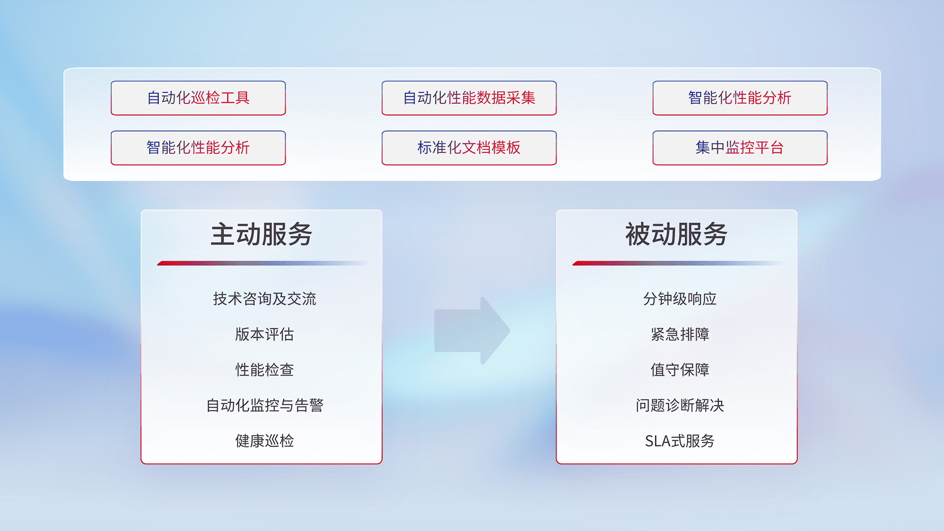 智能化工具和标准化文档,,保障服务质量,,,,提供主动服务(包含技术咨询、、、、版本评估、、、性能检查、、、、自动化监控与告警、、健康巡检)和被动服务包含(分钟级响应、、、、紧急排障、、、值守保障、、、问题诊断解决、、、SLA服务)。。。
